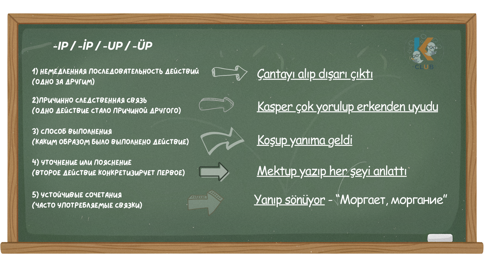 • Пример: Koşup yanıma geldi. (Он прибежал ко мне / Прибежав, пришел ко мне).