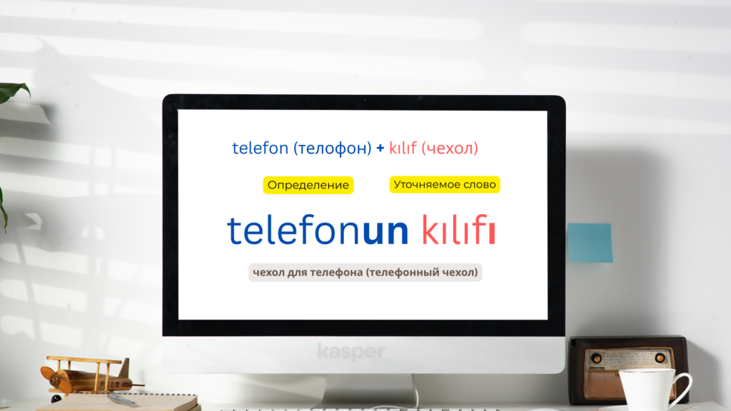 В этом примере слова «telefon – телефон» и «ekran – экран» являются существительными. Существительное «телефон» принимает суффикс притяжательного падежа «-un»; существительное «экран» принимает суффикс притяжательного падежа «-ı», образуя именную группу.
