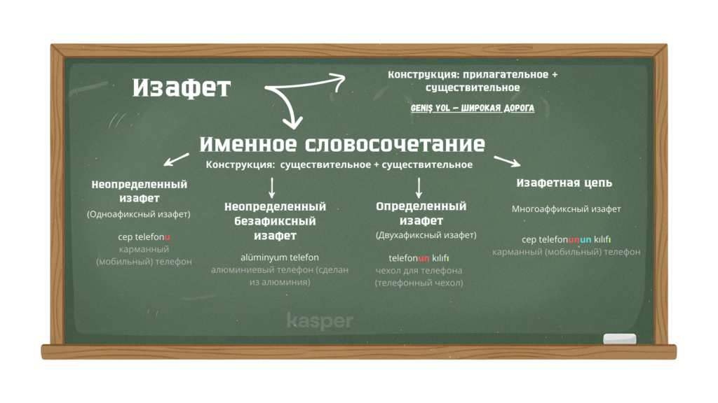 Изафет (İsim Tamlaması) — это словосочетание, образованное путем установления семантической связи между существительным и другим существительным, местоимением или прилагательным, чтобы отличить его от похожих существительных.