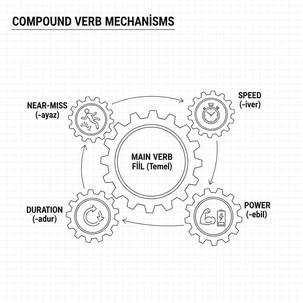 Представь основной глагол как базу, а вспомогательный глагол (vermek, bilmek, durmak) как присадку, которая меняет свойства «топлива».
