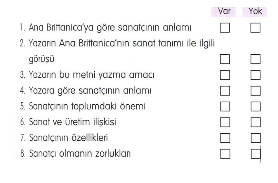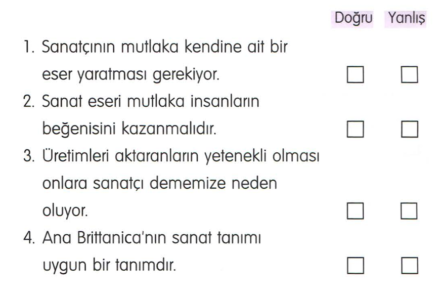 Bana göre de Ana Brittanica’nın tanımı yerindedir. Sanatta en önemli nokta şudur: Sanat üretmektir. Bu durumda da bir kişi, yeni ve özgün eser üretmiyorsa ona sanatçı demememiz gerekir. Oyleyse, saz sanatçılarını, ses sanatçılarını, aktörleri sanatçı kategorisinden çıkarmamız lazım. Çünkü bunlar yeni ve özgün eserler üretmiyorıarı Onlar, başkalarının eserlerini bize iletmekten başka bir şey yapmıyorıarı Onlar sadece üretimleri bize iletmekle görevli insanlar.