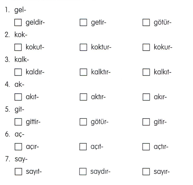| kaldır | -ır-/-ir-/-ur-/-ür- | -tır-/-tir-/-tur-/-tür | Ayşe Hanım bugün akşam yemeğini kızına pişirffi. |