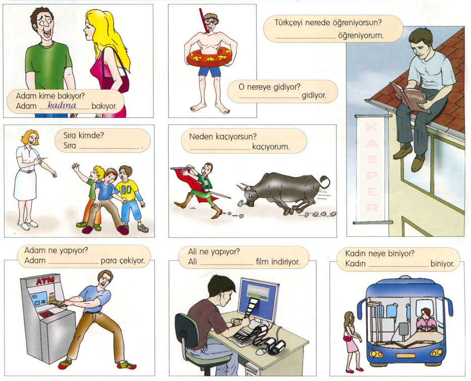 oturmak • korkmak • çıkmak • gitmek • koşmak • hoşlanmak • dinlenmek • girmek • binrnek • ders çalışmak • lV seyretmek • ayrılmak • nefret etmek • top oynamak • yürümek • sıkılmak