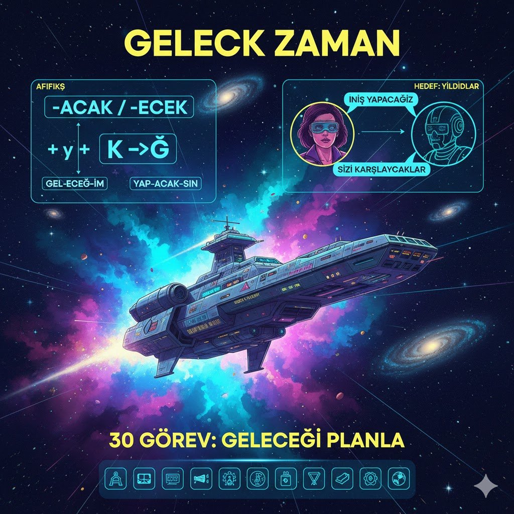 Добро пожаловать на борт, кадет! Сегодня мы изучаем технологию перемещения во времени. В турецком языке Gelecek Zaman — это категоричное будущее. Мы используем его, когда уверены в событии, даем обещание или озвучиваем официальный прогноз.